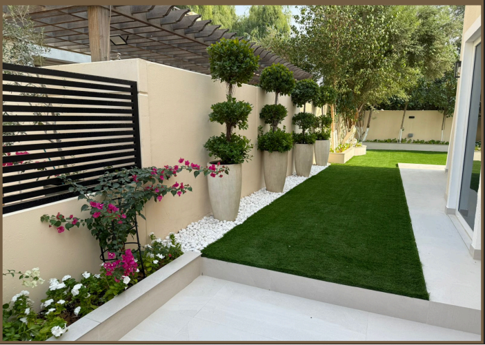 The ground floor includes a fully fitted kitchen, guest washroom, maid’s room, and a spacious living area opening up to a private landscaped garden — ideal for gatherings, relaxation, and outdoor dining.