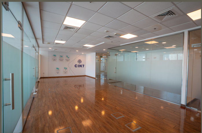 The office features a functional partitioned layout with glass door entrance and private pantry.